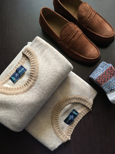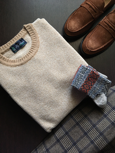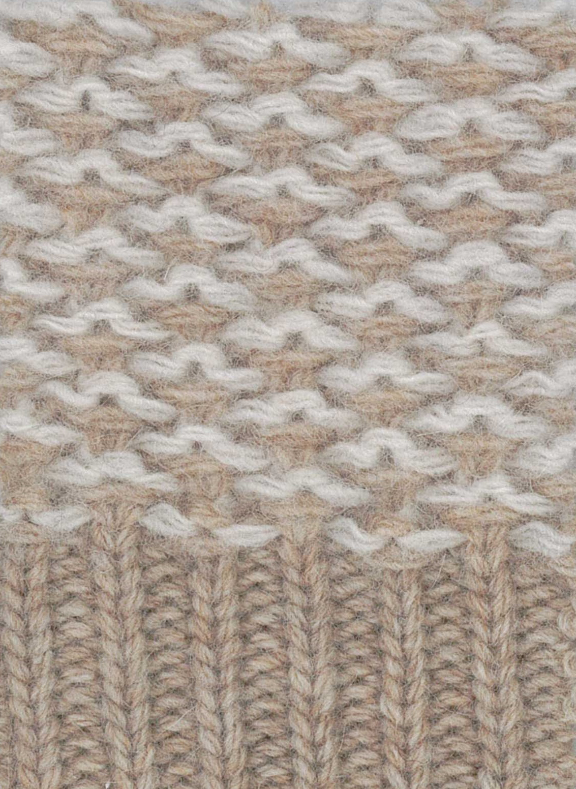Parlando della lavorazione Jacquard potremmo dilungarci in ampie descrizioni tecniche ma preferiamo di gran lunga lasciare la parola alle foto di dettaglio che esaltano questa tipica tessitura caratterizzata dall’intreccio dei fili della trama e dell’ordito. Il risultato finale è quello di un colore base che si miscela con un colore neutro che gli fa da spalla; nel nostro caso abbiamo tre tonalità: Beige, Blu Navy, Grigio Medio. Tale tipologia di tessitura si esalta poi con l’uso di un filato pregiato come il nostro Cashmere e Lana con il quale abbiamo realizzato un Girocollo con lavorazione in Finezza 7 che ci offre una mano corposa ma sempre estremamente morbida con taglie dalla 46 alla 58.
