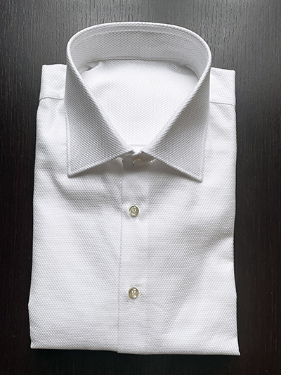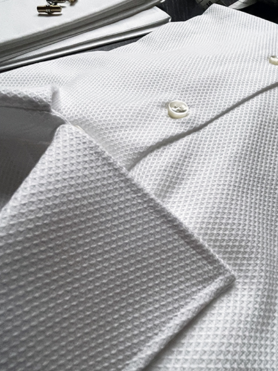 Da poche ore abbiamo archiviato un anno della nostra vita ma già volgiamo fiduciosi lo sguardo verso l’orizzonte consci sia delle opportunità che delle difficoltà che esso ci riserverà. L’unico sguardo che invece volgiamo con piacere verso il recente passato è quello che ci consente di rivolgere un sincero ed enorme grazie a tutti coloro che ci hanno seguito e la cui vicinanza è l’unica linfa che incentiva a migliorarci! Per quanto ci riguarda, da oggi si rientra quindi in modalità testa bassa e pedalare ed ecco la prima, candida e benaugurante, proposta del 2026 ovvero una delle nostre armature preferite come quella del Giro Inglese. Tale trama è costituita dall’incontro di due orditi diversi: uno tradizionalmente dritto e l’altro che si intreccia ad ogni passaggio di trama creando una forma esagonale dalla mano compatta. Si tratta di un tessuto da 187 grammi al metro lineare con la finezza del Titolo 100 in Doppio Ritorto che abbiamo interpretato con il modello di collo Napoli 728 e polso stondato ma, poiché la Camicia viene realizzata su ordinazione, si potrà scegliere tra i ben 18 modelli di collo ed 8 modelli di Polso (basta scaricare il PDF presente nel nostro sito). La Camicia é realizzata solo su prenotazione, e pertanto sarà possibile segnalare eventuali varianti stilistiche (Taschino laterale…) o di misurazione (ad esempio: lunghezza più corta o addirittura su misura) senza alcun aggravio di costo. Qualora si desideri una Camicia su misura, basta fornire le misure richieste seguendo le semplici istruzioni scaricando l’apposito PDF.