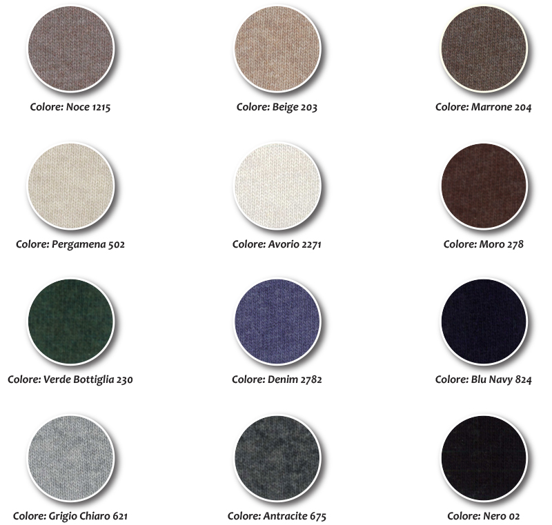Colori: Noce; Beige; Marrone; Pergamena; Avorio; Moro; Verde Bottiglia; Denim; Blu Navy; Grigio Chiaro; Antracite; Nero;