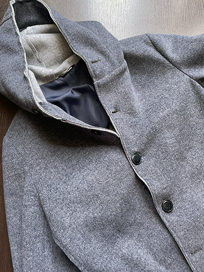 Modello: Montgomery; chiusura con bottoni; cappuccio; tasche a toppa; 2 tasche interne;